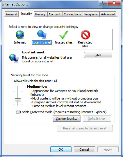 - Go to Tools > Internet Options > Security
