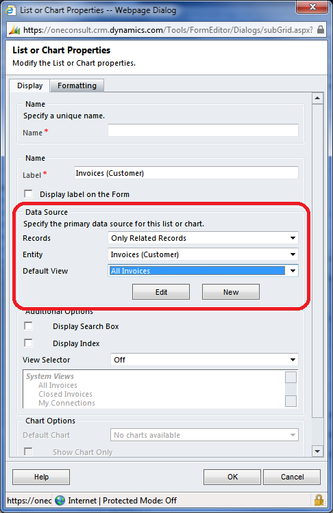 Now this is the important piece. In the Data Sources, Records should be left at Only Related Records. Select the related entity that you want to show on the Account form, let’s say Invoices. Also select a default view. I would strongly recommend customizing a view specifically for this purpose, and be mindful of the number of columns to display, to avoid scrolling.