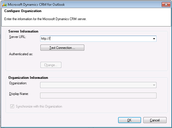 15. First time you launch Outlook after the CRM client installation, you will be prompted to configure the client, by pointing it to the address of your Dynamics CRM server, as well as defining the Organization you will be using.