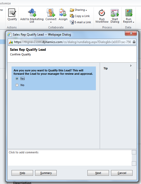 With all this done, and assuming you have the Dialog completed, repackage the solution and import it. Now test it. In my case, from clicking on Qualify, I launch the first question: