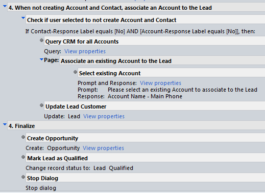 Finally, the fix is pretty simple. If you create your Contact and Account in the same dialog, assign that back to the Lead’s Potential Customer, and use that field when creating the Opportunity. If you’re not creating them in the process, give the user an option to select the Account (do a Query CRM for Accounts), and assign the selected value back to the Lead’s Potential Customer.