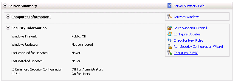 On your main tab, under Server Summary > Security Information click on Configure IE ESC