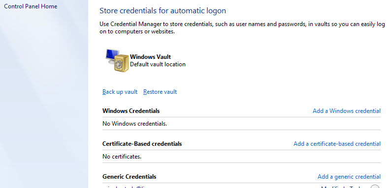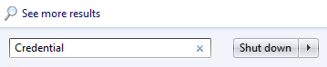 So, if it all comes back to authentication, and almost every other time I get the missing credentials message, where are these credentials stored then? Answer: in the Credential store. How do you get to it? Click on Start, in the Run area type “Credential” (no quotes), and the first suggestion coming back is Credential Manager. Open it.