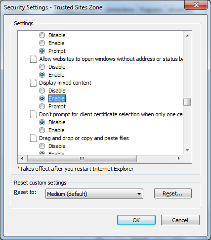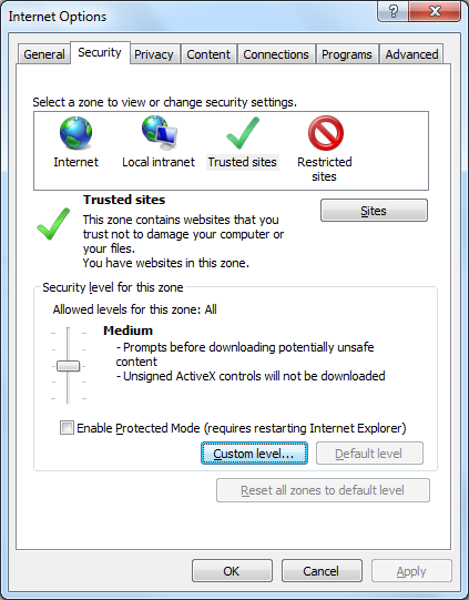 Add LinkedIn to your browser’s trusted sites. In the Trusted Sites configuration, click on Custom level.