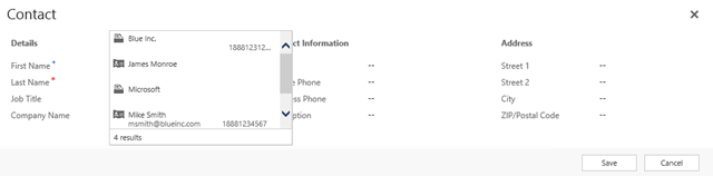 With Dynamics CRM 2015 now we get an option to Quick Create an Account from the Quick Create Contact form. That will just overlap the existing Quick Create Contact form with the Quick Create Account form. Once the Account is created, we are returned to the Quick Create Contact form, and the Company Name is populated with the Account we just created.