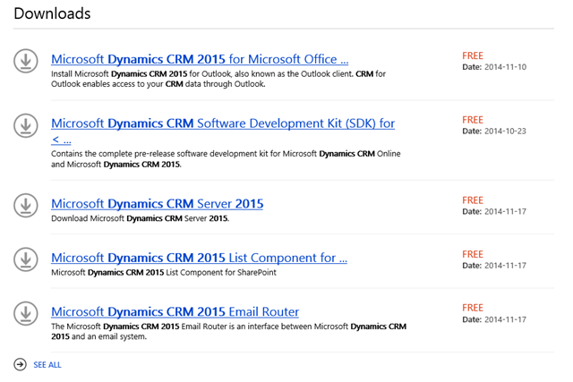 Running a quick search on Microsoft Download Center presents the following available downloads for Dynamics CRM 2015:
