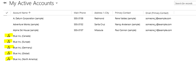Starting with Dynamics CRM 2015, for records related in a parent-child relationship (1:N), you can now see a graphical representation of these relationships. Starting in a regular grid view, now the related records are presented with a new icon in front of them.