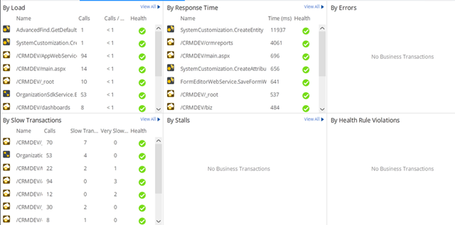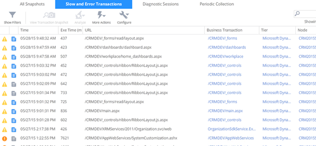Agents – these are individual monitoring apps loaded on all the machines in the environment. There are various types of controllers, based on the type of application that we monitor. We have Java agents, .NET agents, PHP agents, Node.js agents, as well as database agents. Each plays it’s own role in monitoring an application, and they are pretty self descriptive. For the purpose of monitoring a Dynamics CRM environment, we look at the following agents: