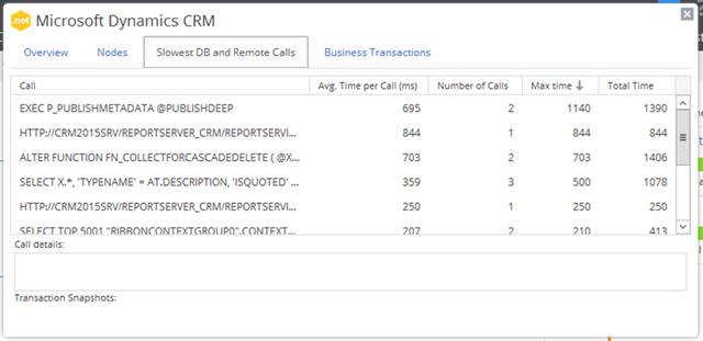 Going to the Slowest DB and remote Calls tab presents us with a listing of the calls and times. We can do some sorting to quickly get to the information we need.