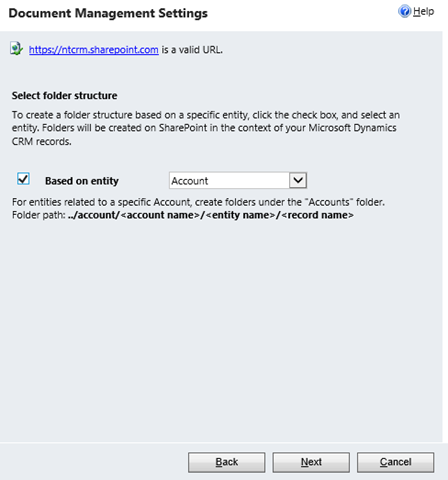On the next window you are prompted to choose the base entity to use when defining the folder structure. For this example I have selected to use this option, and choose Account.