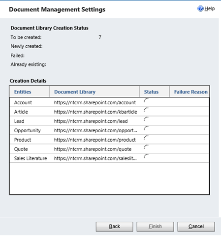 The next screen shows us the progress on creating the folder structure on the SharePoint side for each entity type.