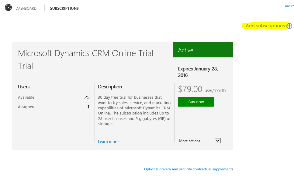 In the Office 365 Admin portal, once you logged in with the credentials for your Dynamics CRM trial organization, navigate to Billing > Subscriptions
