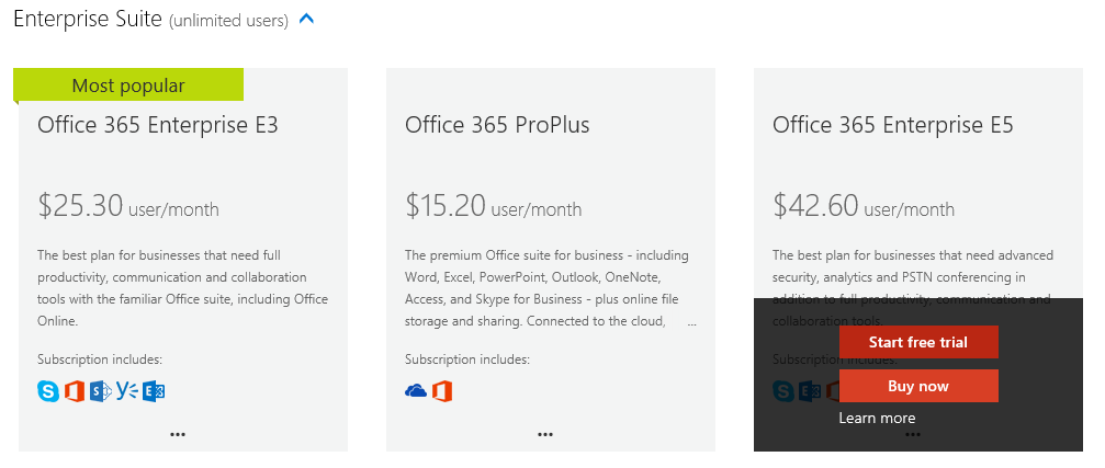 On the next page, scroll down until you find the Enterprise Suite section. Here you can choose to add a trial of Office 365 Enterprise E3, Office 365 ProPlus or Office 365 Enterprise E5. E5 replaces the old E4 and adds a few new features. E3 is still the most popular option. For the purpose of the demo, go for the best available option. That is, select the E5 trial.