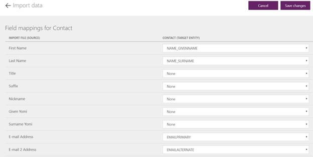 I’ll be mapping a few of the most common fields, like name(s), email addresses, phone numbers, etc. When complete, click on the Save changes button at the top of the screen to confirm your mapping. You will be prompted if there are any errors detected in the mapping, and you can go back and correct them before you begin your import process.