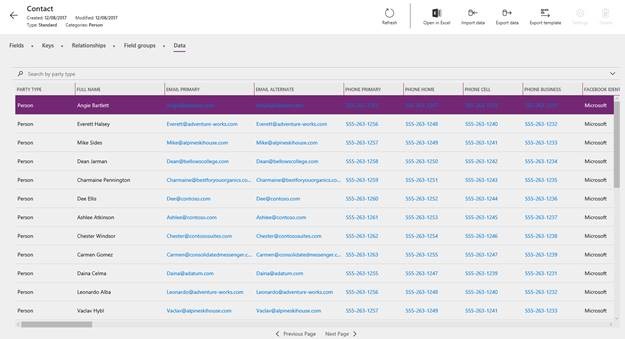 Now go back to the Contact entity. Click on the Data tab, and validate that the data you imported is in fact available. Your view should show the records as below.