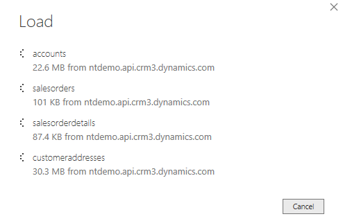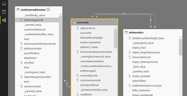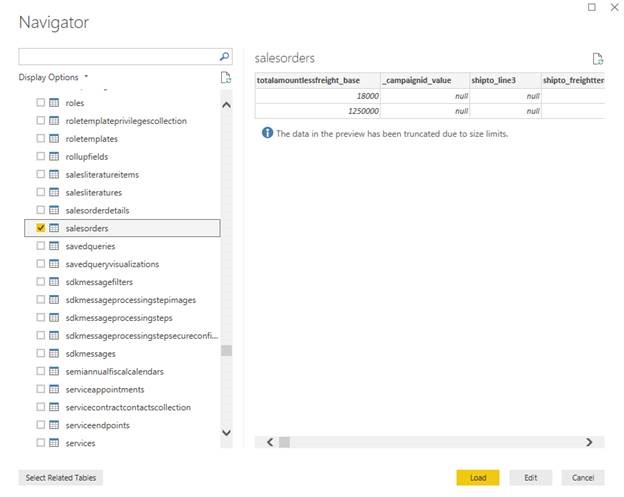 Once you chose your entities, you can click on Select Related Tables to add to your data set tables with matching key columns in a 1:M relationship, but if you take that approach, make sure and validate what else is being pulled in. You could bring in too much data you don’t really need, like for example entities data related to Field and Project Service if these solutions are installed in your environment. You might not want that data for what you are trying to achieve. Alternatively, knowing the data model in CRM you can create the relationship in the Power BI model and bring in only the minimum amount of data you require.