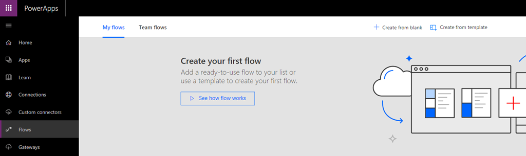 Alternately, you can start from scratch and create your own flow. To see how hat works, let’s go ahead and create our own simplistic flow that created a CDS Account record when a new Account is added in D365.