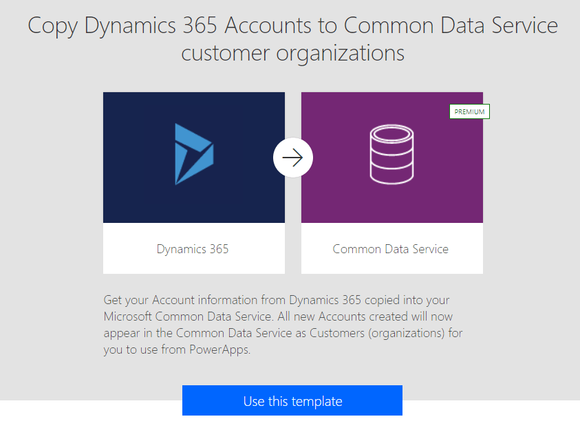 To find existing templates, go to flow.microsoft.com and search for dynamics. You’ll find a long list of results. Select the one to copy Accounts to CDS, and select Use this template if you intend to use an existing template.