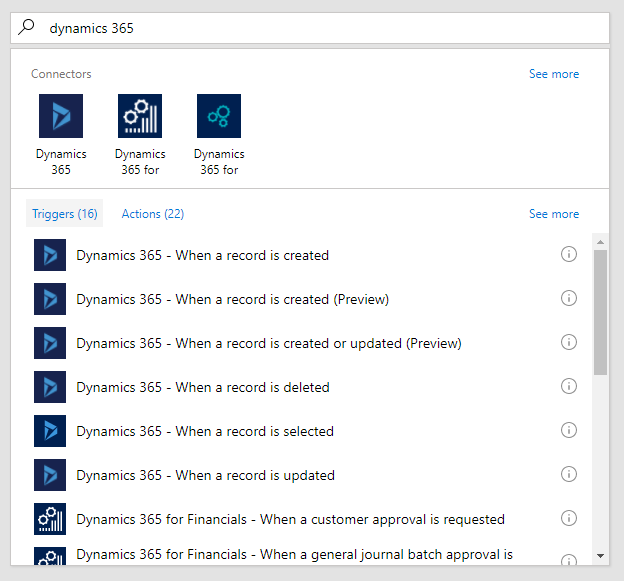 In the search box type Dynamics 365, and select it from the connectors. You can just select the trigger directly. In our case, we’re looking for a trigger of “When a record is created”.
