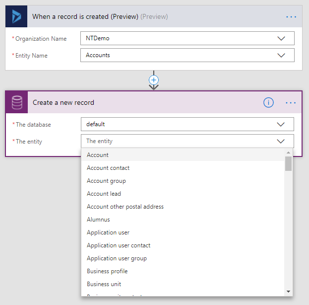 Select the Preview trigger as it includes option set selected values as strings. Once you select the organization and Accounts for entity, create a new step. Select Add an action.