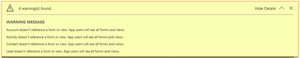 And when satisfied with your customizations, again Save, Validate and Publish the entire app. And here validation kicks in again if you were lazy like me for this example. I’ve left all assets on All, and I’m prompted with warning messages. Got to do a better job next time!