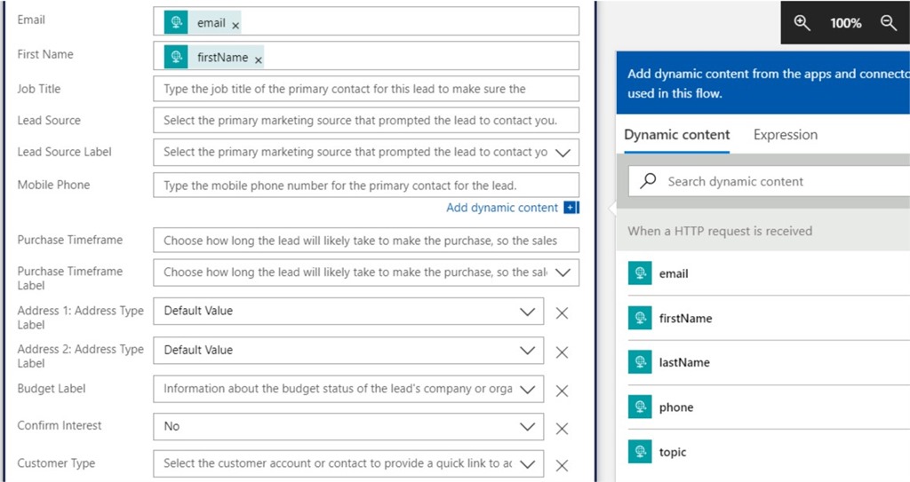 Sign in to your D365 instance, and select Leads from the drop-down. Now you can start populating the fields with the values received from the request.