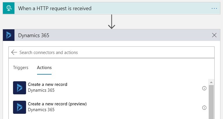 Next add a new step, find Dynamics 365 and select “Create a new record”.