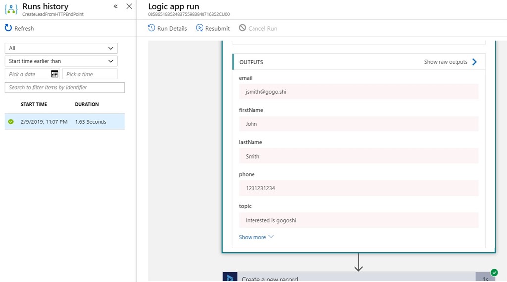 You can test this by passing the payload using Postman, or you can do it directly from your WordPress plugin. You can monitor the execution in Logic Apps, and then confirm the new Lead created in Dynamics 365 for Sales.