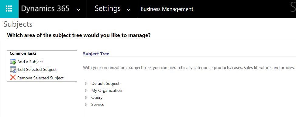 Taking a page from the SharePoint world, and looking inwards to the Dynamics 365 platform, and in particular at the Customer Service app, we find a somewhat slimmed-down version of Taxonomy definition in the Subjects area. You can find it under Settings > Business Management > Subjects.